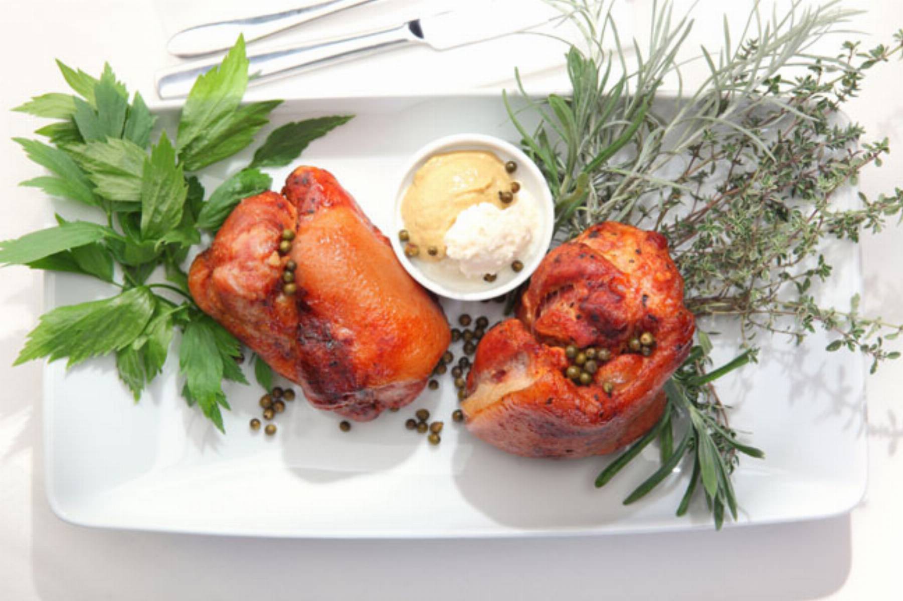 Golonkę kładziemy na ruszt i grillujemy z obu stron aż zarumieni się na złoty kolor. Podajemy w kompozycji ze świeżymi ziołami.