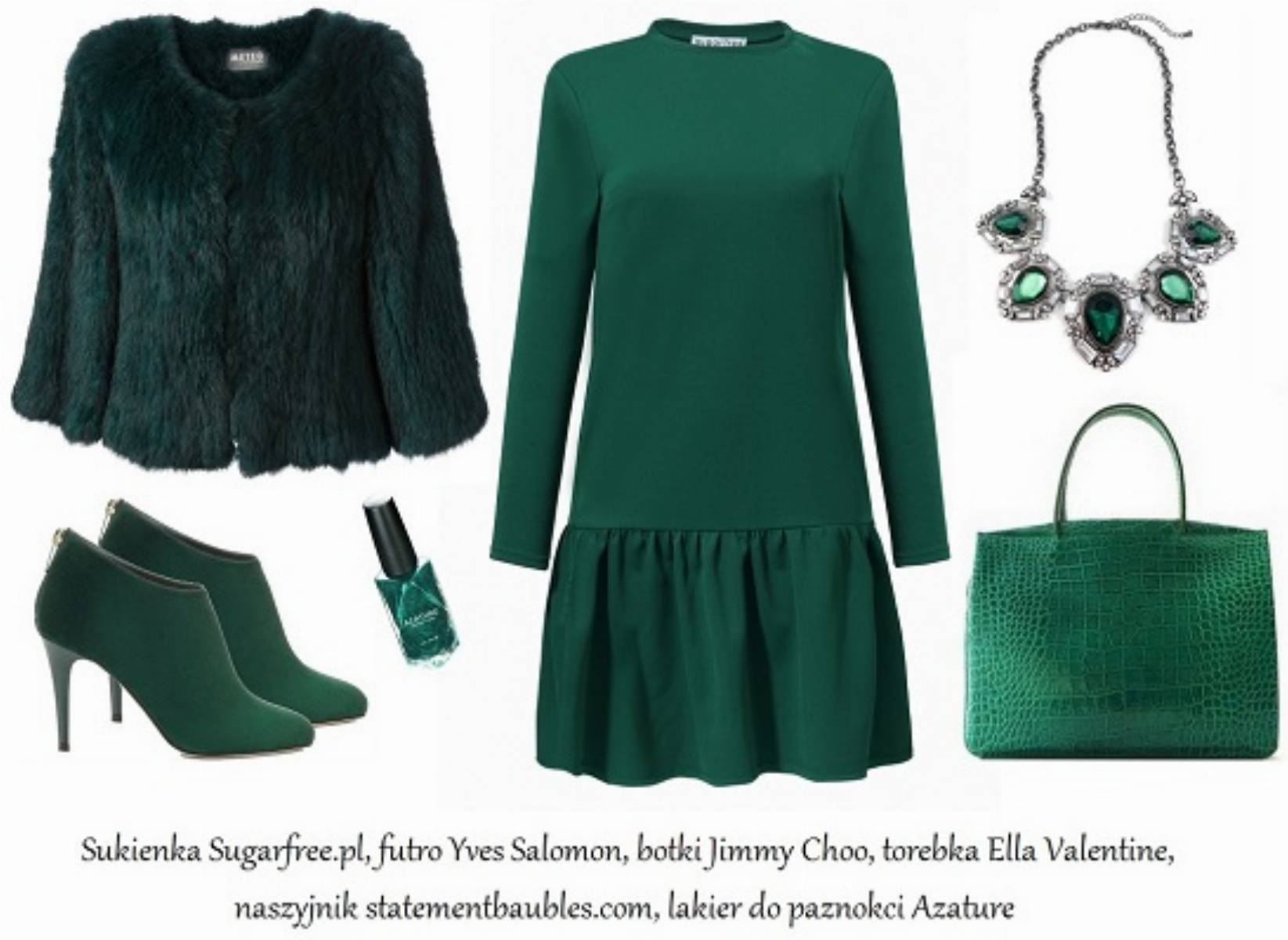 Szmaragd przywraca harmonię oraz przynosi szczęście w biznesie, a nasza stylizacja świetnie sprawdzi się nie tylko na co dzień, ale też podczas wieczornych wyjść. Zielona sukienka w połączeniu z futrem oraz srebrnym naszyjnikiem wysadzanym szmaragdami, stworzy stylizację obok której nikt nie przejdzie obojętnie. Stylowe botki wysmuklą nogi, a torba ze wzorem imitującym krokodylą skórę będzie stanowić ciekawe uzupełnienie tej stylizacji. Jak Wam się podoba?