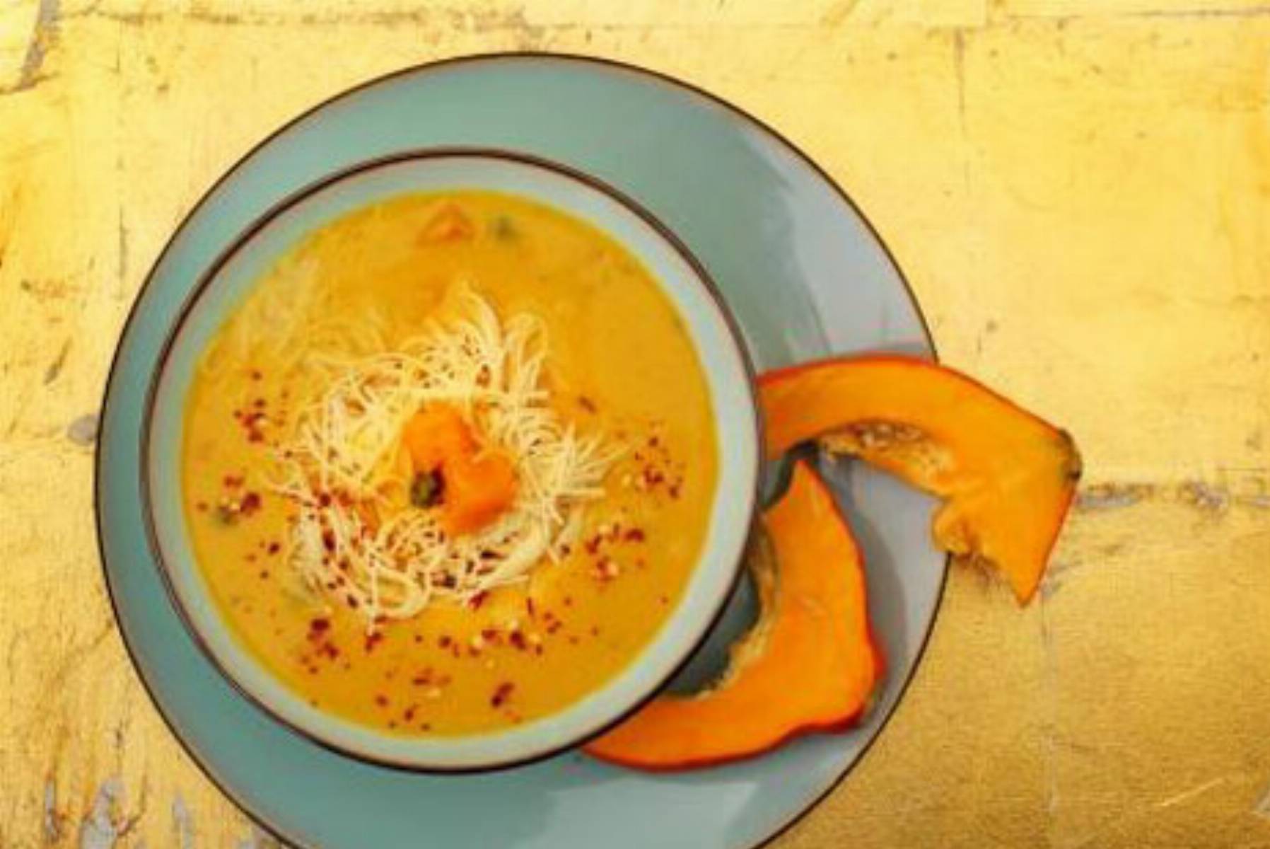 Zupa dyniowa z kaparami, płatkami chili i makaronem