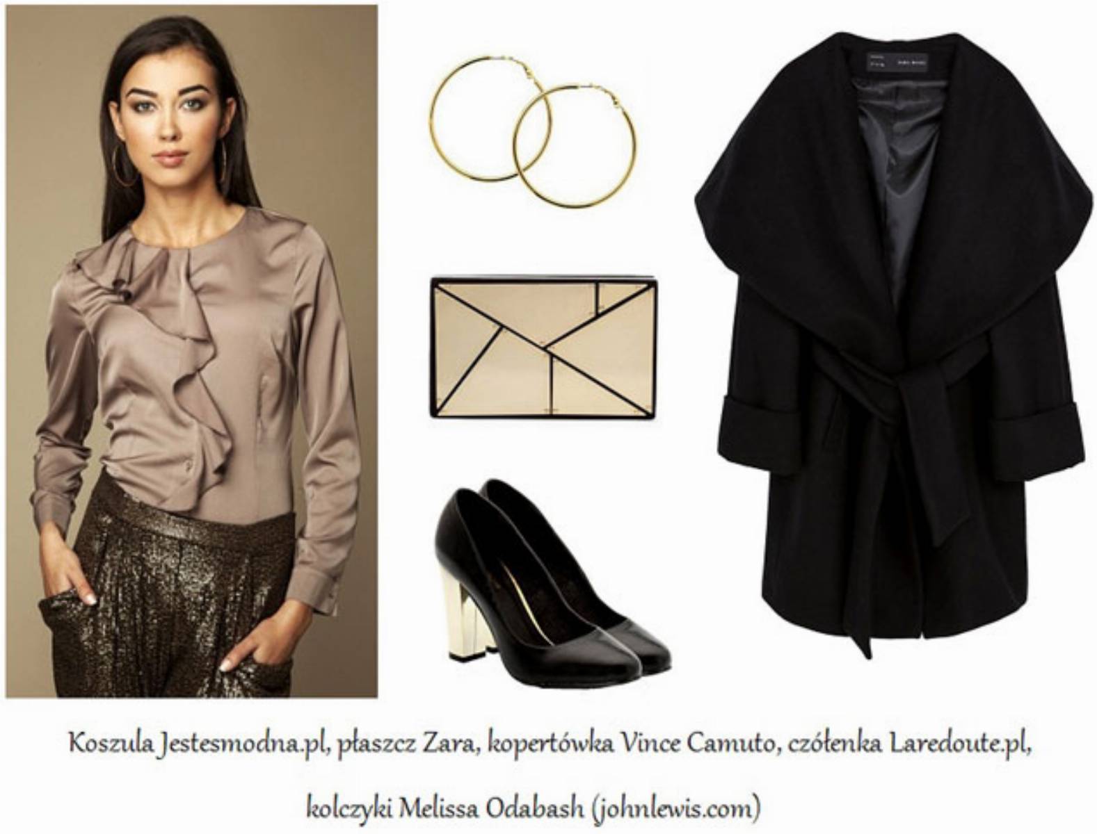 Duet czerni i złota to coś, co zawsze robi wrażenie, a ponadto doskonale wkomponowuje się w świąteczny klimat. Ozdobiona charakterystyczną falbaną połyskująca koszula ze sklepu Jestesmodna.pl stworzy zgrany duet z metalicznymi spodniami. Czarny płaszcz z ogromnym szalowym kołnierzem doda szyku, a czółenka na złotym obcasie przykują uwagę. Ciekawym uzupełnieniem tej stylizacji będą oryginalna kopertówka oraz kolczyki koła.