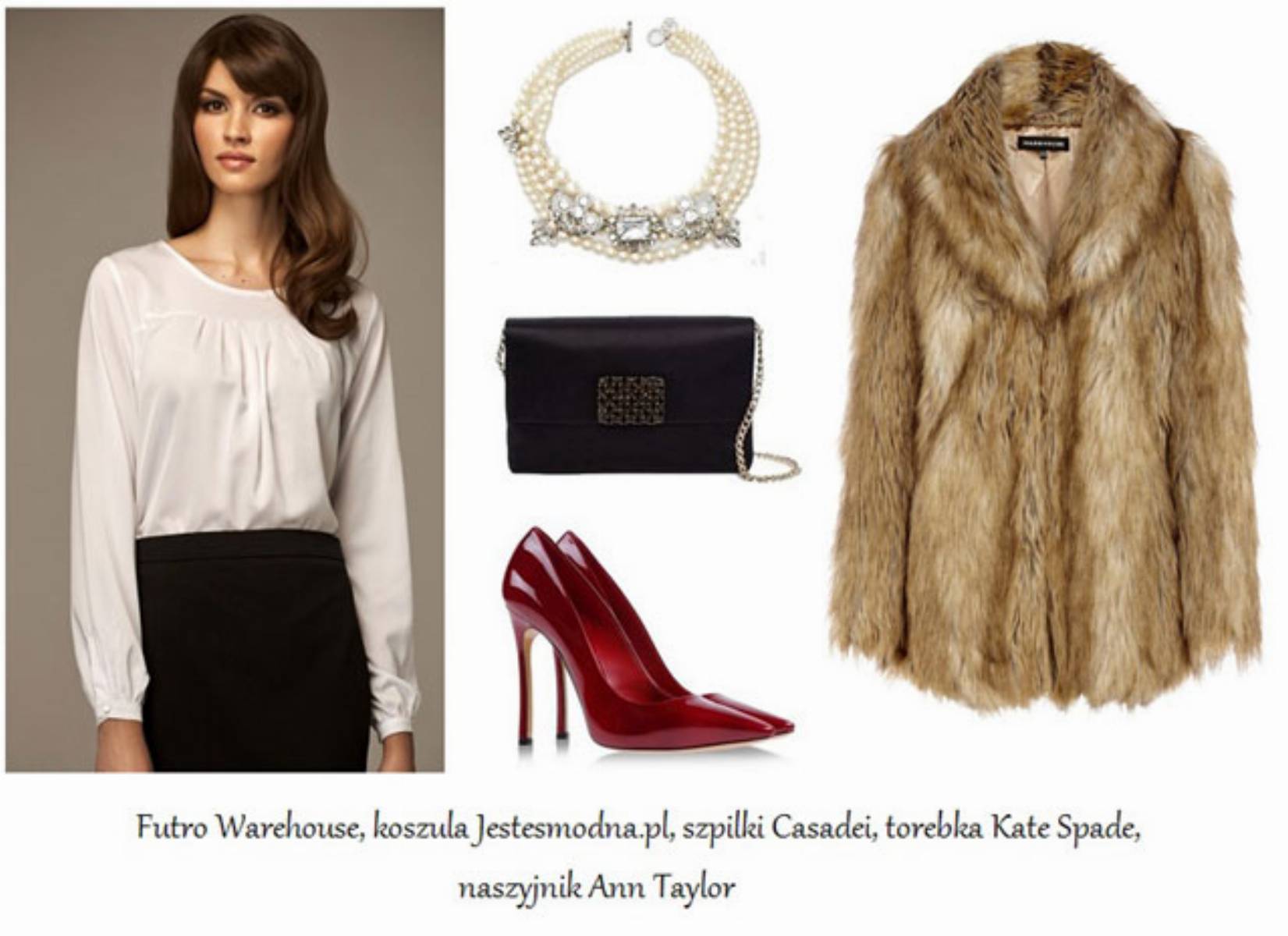 Kolejna nasza propozycja jest dość klasyczna. Oto biała bluzka zestawiona z czarną spódnicą. Aby nadać tej stylizacji charakteru warto postawić na szpilki skąpane w kolorze wina, a także ozdobiony kryształkami naszyjnik z pereł. Eleganckie futro ogrzeje w zimowy wieczór, a torebka na łańcuszku pomieści wszystkie niezbędne drobiazgi.