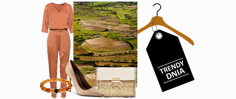 Stylizacja w kolorach ziemi, której bazą jest wiązany w pasie, orzechowy kombinezon od Bonprix, doskonale oddający wczesnojesienne nastroje. Uzupełniają go akcenty, w których zachowało się jeszcze ciepło letnich dni – urocza bransoletka z bursztynu i pleciony koszyk-kuferek, który – obok pomadki, lusterka i puderniczki – pomieści kilka wakacyjnych skarbów i pamiątek z wojaży. Outfit zamykają lakierowane, skórzane szpilki marki Kazar w kolorze nude, które nadają kompozycji eleganckiego wyrazu.