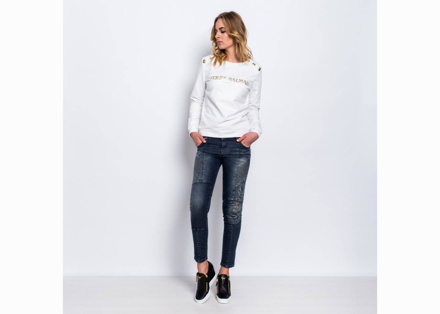 Sukienki są niezwykle kobiece ale równie często kobiety chodzą w spodniach. Są one nie tylko wygodne, ale także idealnie podkreślają kobiece kształty. Modne spodnie Pierre Balmain w tym sezonie to przede wszystkim jeansy w jasnych kolorach z efektownymi przetarciami i dziurami. Idealne do białych koszulek i wygodnych sneakersów. Będzie to świetna stylizacja na każdy, luźny dzień.