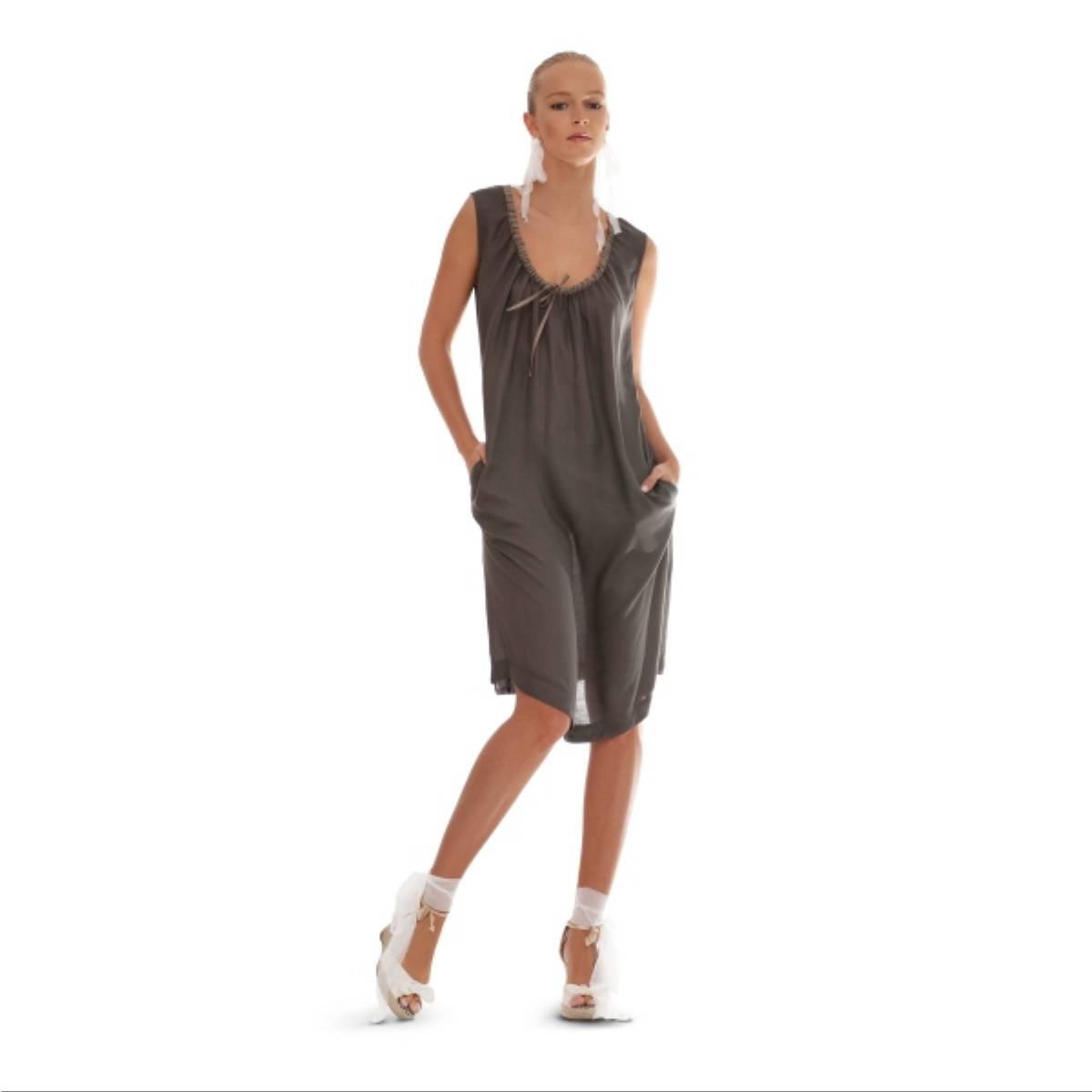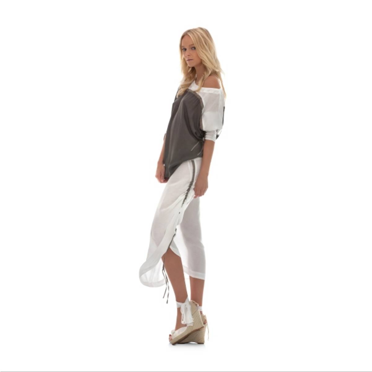 Graficzną, bardzo daleką inspiracją do tworzenia tej kolekcji były sportowe marki odzieżowe, w których, podobnie jak tutaj, blokowe łączenie kolorów/tkanin przeplata się z linią/kreską/paskiem. „Sportowe ubranie” w tej kolekcji, pozbawione krzykliwych barw często spotykanych w odzieży sportowej, dzięki miękkości tkanin i kolorów nabrało niesłychanie kobiecego i delikatnego oddźwięku. Kolekcja po przez dobór tkanin jest „podszyta wiatrem” – lekka, swobodnie poruszająca się przy każdym podmuchu. Tkaniny użyte w niej aktywnie „współpracują” z ciałem podczas upalnych dni. Szerokie i luźne kroje nie burzą jednak kobiecej sylwetki. Podkreślają ją po przez lekkość tkanin, które w subtelny sposób opływają sylwetkę uwypuklając to co niewidoczne dla oczu.
