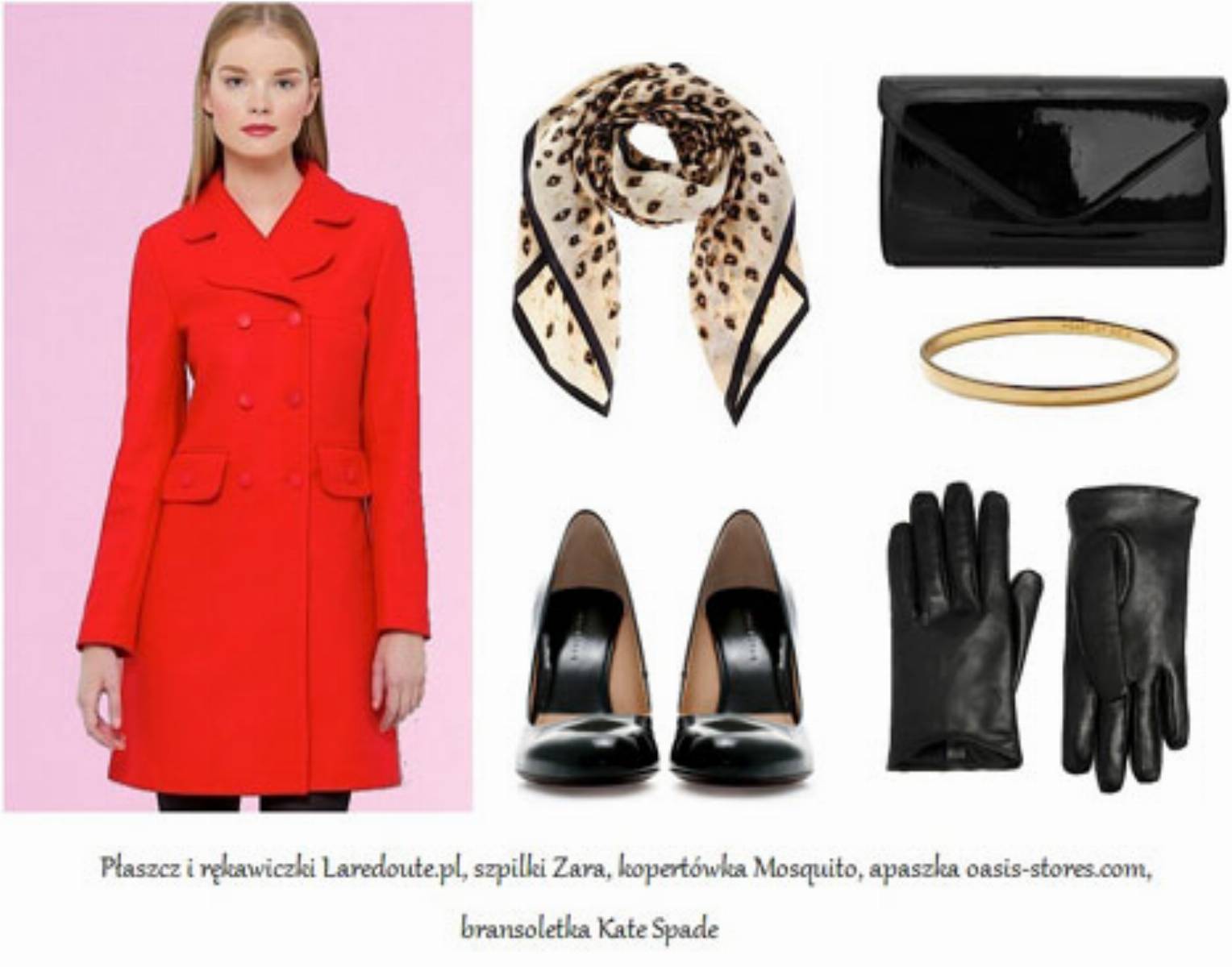 Ostatnia nasza stylizacja to ponadczasowe połączenie czerwieni i czerni. Klasyczny, dwurzędowy płaszcz stworzy zgrany duet ze skórzanymi czółenkami. Dodatkami, które świetnie dopełnią ten look, będą lakierowana kopertówka, elegancka apaszka, a także delikatna, złota bransoletka. Co Wy na to?