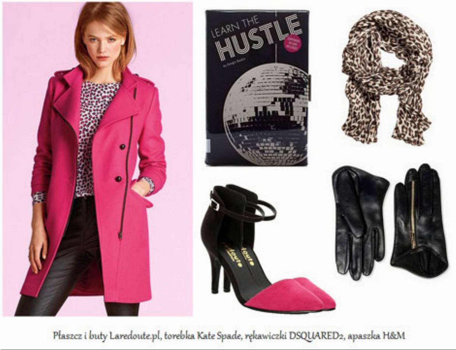 Pierwsza nasza propozycja to połączenie różowego płaszcza ze sklepu Laredoute.pl z panterkową bluzką i czarnymi spodniami. Zestaw ten doskonale dopełnią stylowe sandały, skórzane rękawiczki, ozdobiona cętkami chusta oraz oryginalna kopertówka. Jak Wam się podoba?