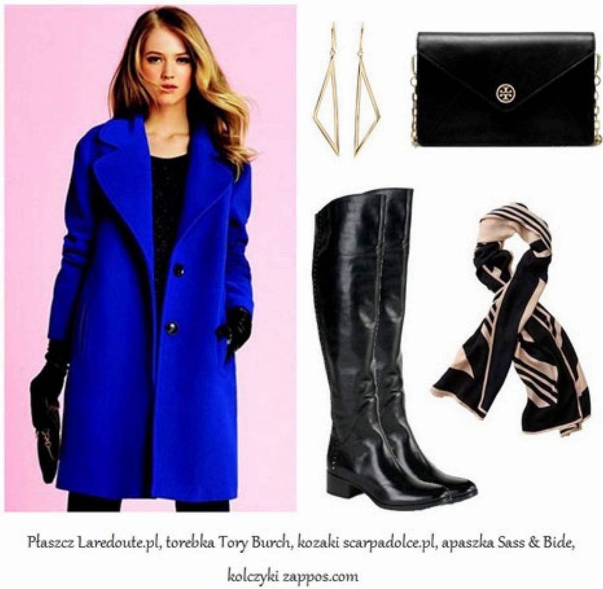 Prosty, kobaltowy płaszcz z szerokimi klapami i dużymi, czarnymi guzikami będzie świetnie współgrał ze skórzanymi oficerkami, a także innymi, skąpanymi w czerni dodatkami: rękawiczkami, torebką na złotym łańcuszku czy apaszką w czarno-beżowy wzór.