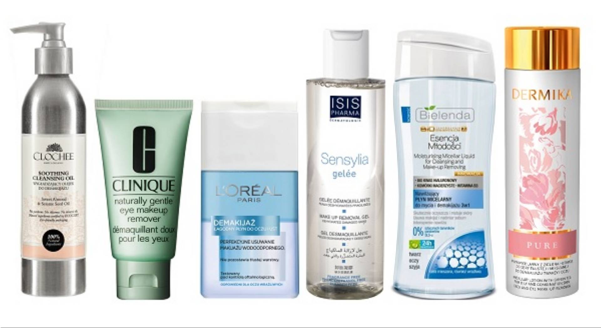 1. Olejek wygładzający do mycia twarzy i demakijażu Clochee 250 ml, cena ok. 89 zł; 2. Krem do demakijażu Clinique Naturally Gentle Eye Make Up Remover 75 ml, cena ok. 73 zł; 3. Łagodny, dwufazowy płyn do demakijażu Loreal 125 ml, cena ok. 12 zł; 4. Delikatny żel do demakijażu Isispharma Sensylia 200 ml, cena ok. 49 zł; 5. Nawilżający płyn micelarny Bielenda Biotechnologia 30+ 200 ml, cena ok. 14 zł; 6.Tonik z kwasami AHD o właściwościach nawilżająco-złuszczających Dermika Pure 200 ml, cena ok. 25 zł.