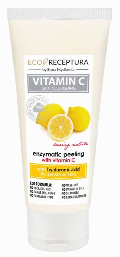 Vitamin C peeling enzymatyczny Stara Mydlarnia został skomponowany z roślinnych enzymów: papainy i bromelainy z domieszką kwasu mlekowego i cytrynowego. Zawiera również wit. C (redukuje przebarwienia), pantenol (działa przeciwzapalnie, regeneruje), kwas hialuronowy (ujędrnia skórę), olej marchewkowy (wygładza i nawilża), wit. E (wzmacnia barierę naskórkową). Słowem: cały zestaw składników anti-aging. Produkt nie zawiera natomiast: SLES, SLS, ALS, PARABENS, PEG-S, FORMALDEHYDE, VASELINE, PARAFFIN OILS, SILICONES, ETHANOLAMINES.