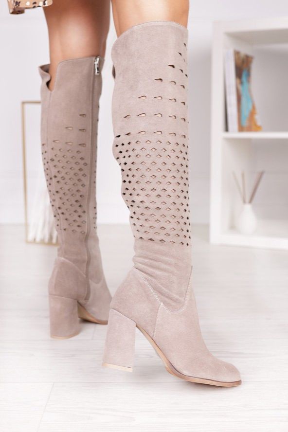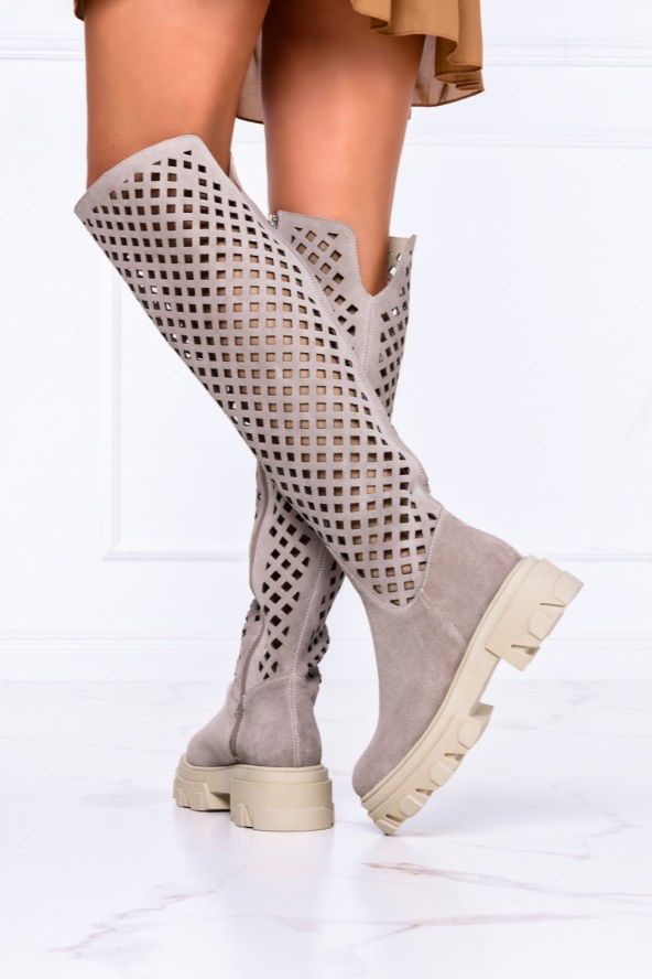 Takie kozaki ażurowe doskonale wyglądają zarówno w wersji na płaskiej podeszwie, jak i na słupku.