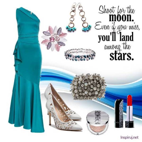 Pierwszy z zestawów bazuje na długiej, ciemnozielonej sukni z falbankami i bardzo oryginalnych ażurowych czółenkach na wysokich obcasie. Dodatki to lśniąca biżuteria z kamieniami utrzymanymi w dopasowanych odcieniach i ekscentryczna kopertówka z fakturą z połyskliwych kuleczek. Całość uzupełnia elegancki makijaż wykonany kosmetykami Lancome i ArtDeco.