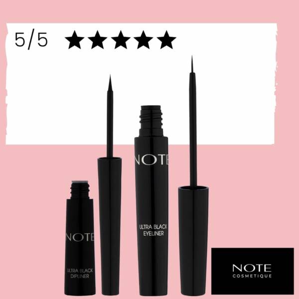 Tusz do kresek w płynie ULTRA BLACK DIPLINER NOTE Cosmétique ma wyprofilowany, elastyczny pędzelek, który tworzy na powiece idealnie cienką i równą linię. Pozwala na skorygowanie konturu oka i nadanie mu pożądanego kształtu. Długotrwała, napigmentowana, formuła z łatwością rozprowadza się, szybko wysycha, nie kruszy się i nie rozmazuje, zapewniając intensywny kolor.