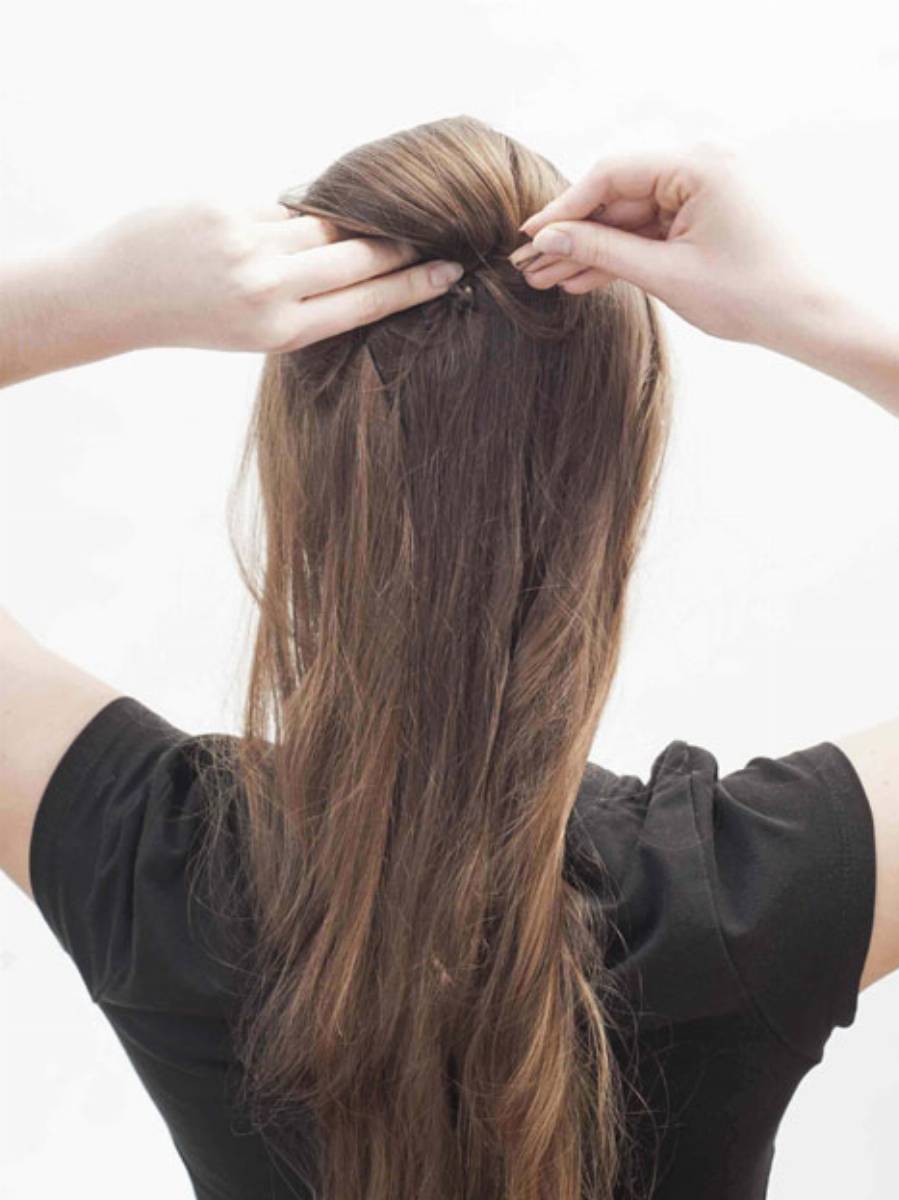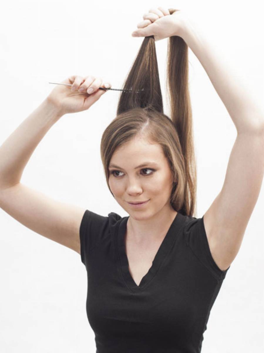 Wydziel dość dużą partię włosów w tylnej, górnej części głowy. Następnie lekko natapiruj tę część włosów. Umieść grzebień na wysokości ok. 10 cm od skóry i przesuwaj go w stronę głowy.