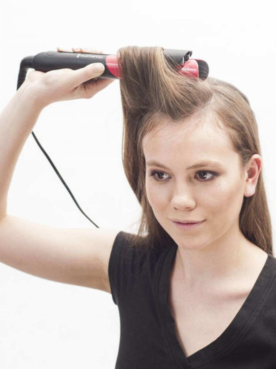 Wydziel pasmo włosów z przodu głowy – grzywkę. Umieść prostownicę jak najbliżej skóry głowy, a następnie spiralnym ruchem zakręć włosy od nasady w tył głowy podnosząc ich spodnią część do góry. Nie musisz zakręcać włosów na całej długości. Wystarczy, że stworzysz łuk przy nasadzie włosów.