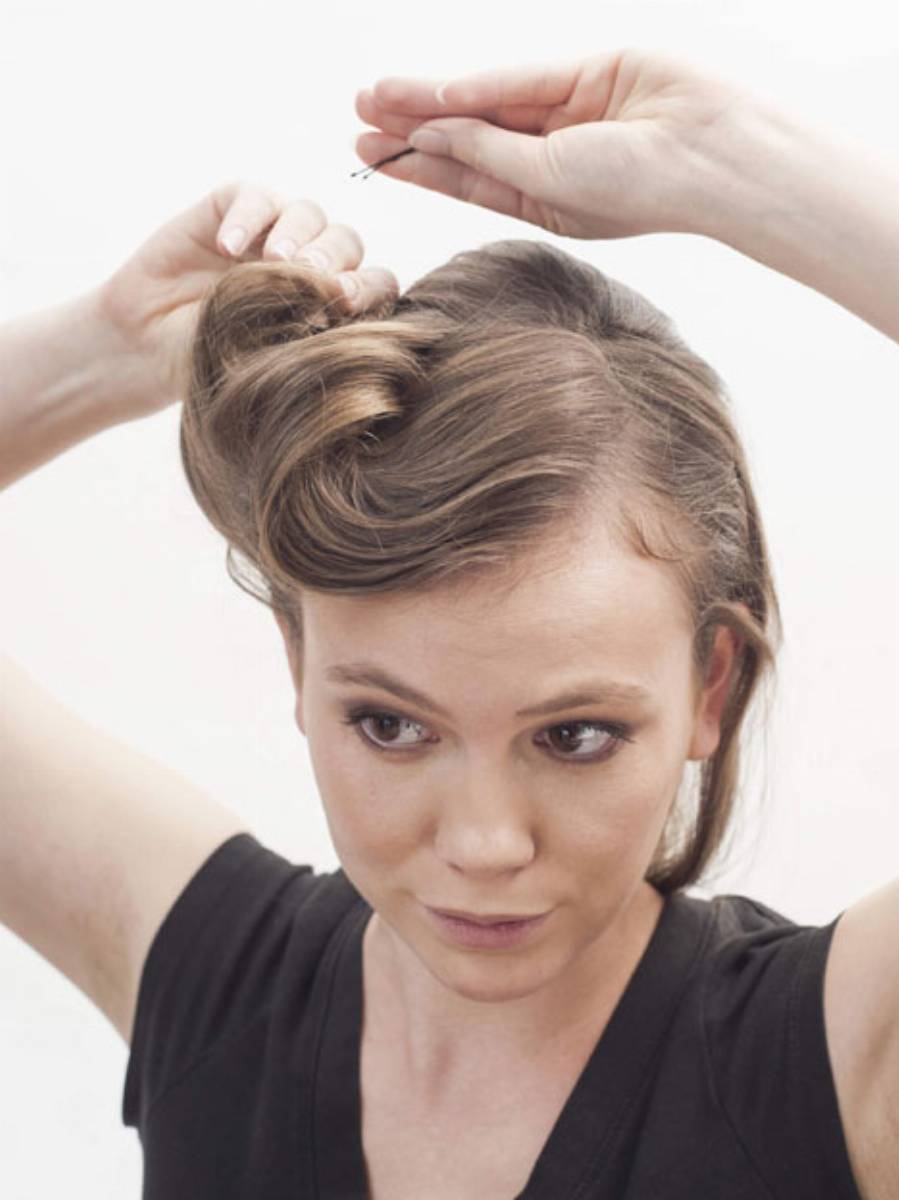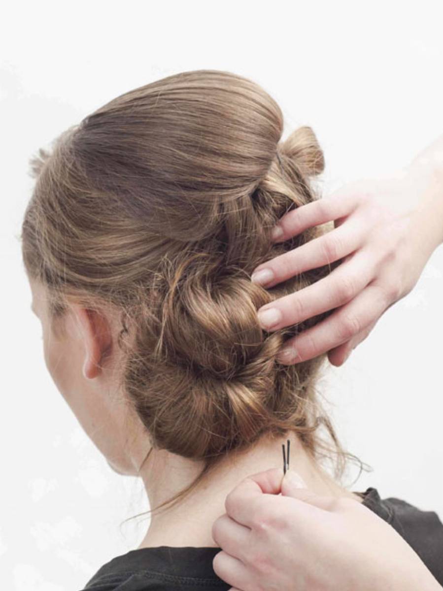 Przypnij zawiniętą część włosów wsuwkami. Użyj ich jak najwięcej, aby konstrukcja była stabilna.