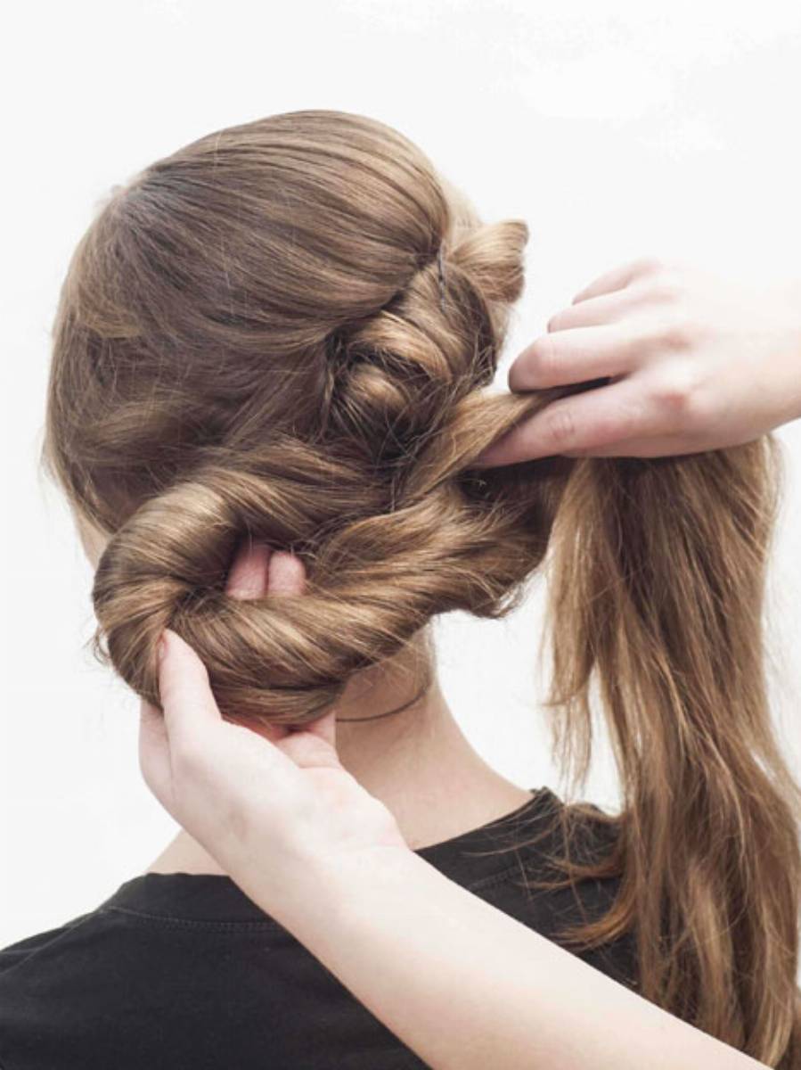 Pozostałą część włosów zbierz w dolnej części głowy. Skręć włosy, jednocześnie zwijając je w kształt przypominający precel. Przy tym kroku możesz potrzebować pomocy drugiej osoby.