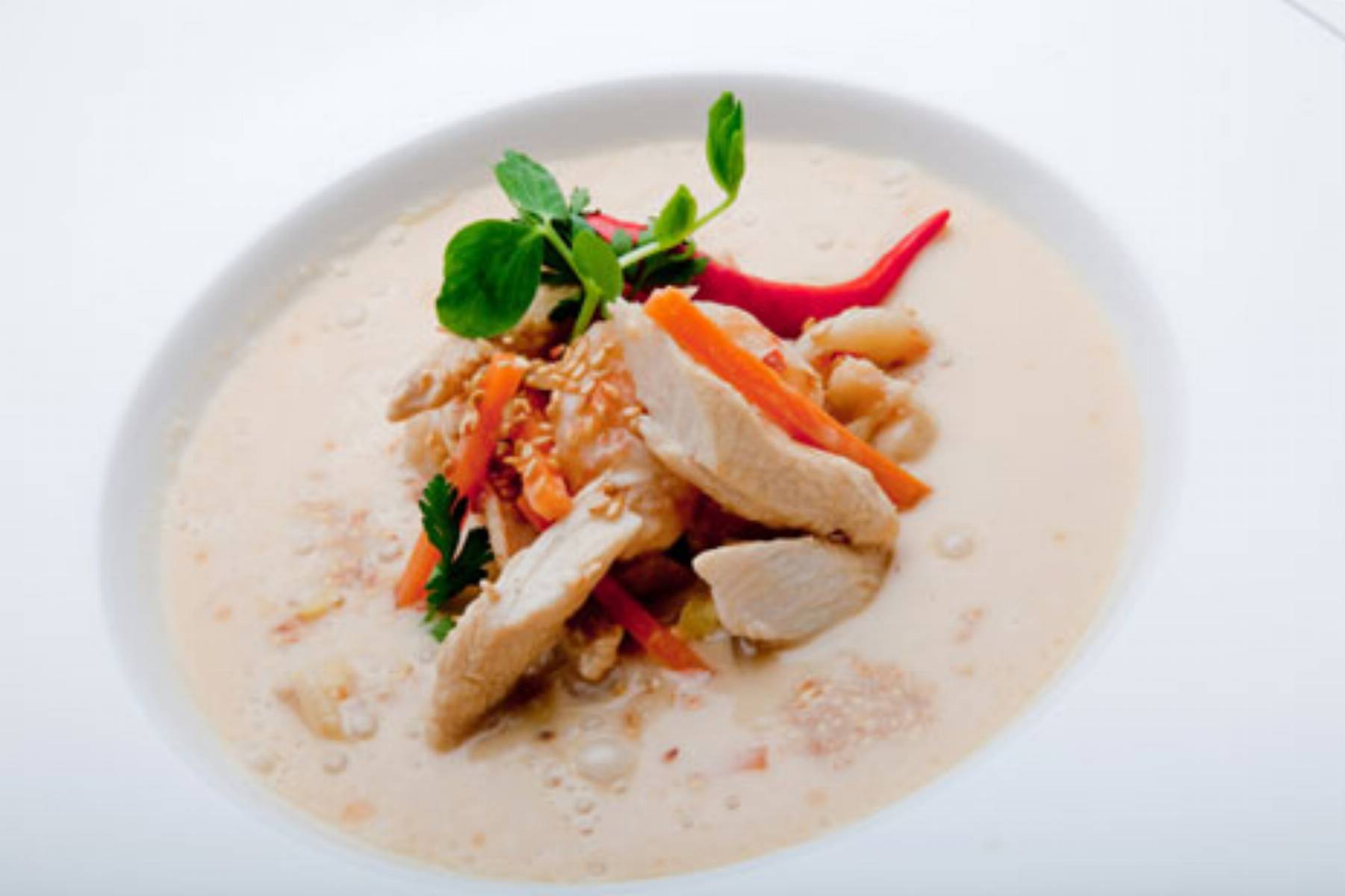 Jedną z najlepszych i najbardziej oryginalnych kuchni świata jest kuchnia tajska, uwielbiana przez wielu za niepowtarzalną umiejętność łączenia różnych smaków i aromatów. To także kuchnia niezwykle lekka i zdrowa – bazująca na owocach morza, delikatnym mięsie, warzywach i aromatycznych przyprawach. Konrad Birek, zainspirowany sztuką kulinarną Tajlandii, poleca orientalną zupę z kurczakiem, krewetkami, mlekiem kokosowym i świeżą kolendrą. Do jej przygotowania, oprócz mięsa z Kurczaka Zagrodowego, potrzebne będzie mleczko kokosowe oraz charakterystyczne dla dań azjatyckich przyprawy: trawa cytrynowa, świeży imbir oraz liście limonki.
