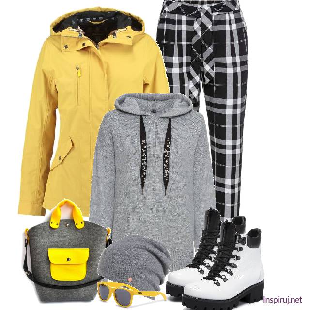 W drugiej propozycji widać zabawę z detalami, ale i z konwencją. Takim prztyczkiem w nos deszczowej pogodzie są okulary przeciwsłoneczne! Pomysł zresztą bardzo praktyczny, bo przynajmniej deszcz nie zacina w oczy. Młodzieżowego sznytu nadają spodnie w kratę z Bonprix, białe botki na grubej podeszwie (nowość marki Simen) oraz szara filcowa torba z zabawną żółtą kieszonką. Stylizacja odpowiednia dla osoby, która traktuje siebie i świat z przymrużeniem oka.