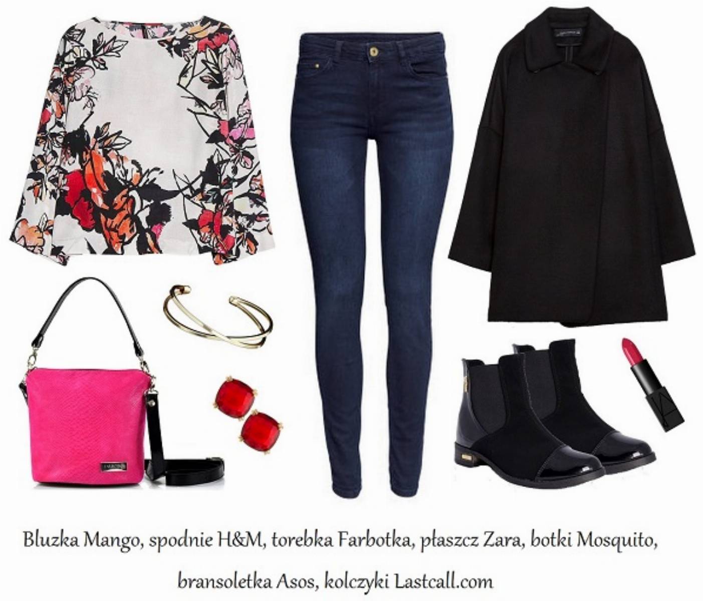 Tym razem kwiaty wędrują na ubrania! Aby otrzymać stylizację w sam raz na spotkanie z przyjaciółkami, tę skąpaną w kwiatach bluzkę zestawiłyśmy z ciemnymi jeansami, czarnym płaszczem oraz botkami z lakierowanym noskiem. Skórzana torebka w kolorze mocnego różu nie tylko świetnie koresponuje z bluzką, ale też doskonale dopełnia cały look! Jak Wam się podoba?