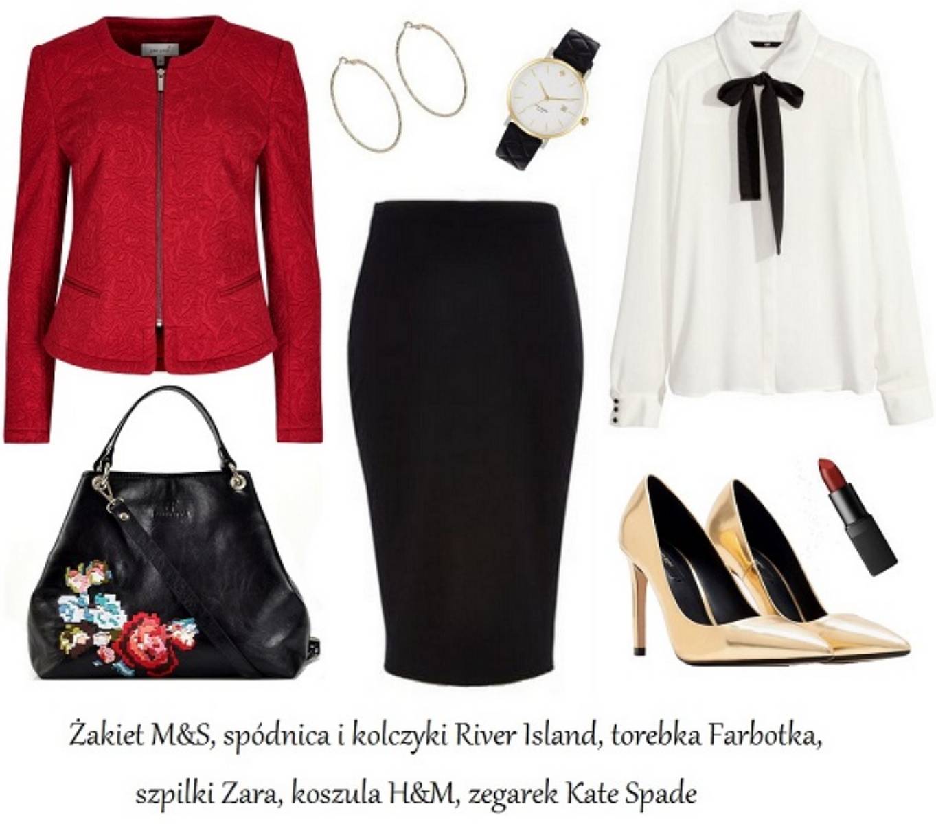 Jeśli nie obowiązuje Was sztywny dress code, możecie trochę poszaleć komponując zestaw do pracy. Ołówkowa spódnica oraz biała koszula z czarną wstążką tworzą bardzo zgrany duet. Żeby nie było nudno, to klasyczne zestawienie urozmaiciłyśmy żakardowym żakietem w kolorze czerwieni, złotymi czółenkami, które w razie konieczności można zastąpić zwykłymi, czarnymi, a także skórzaną torebką w kształcie kuferka, którą zdobi wielobarwny haft.