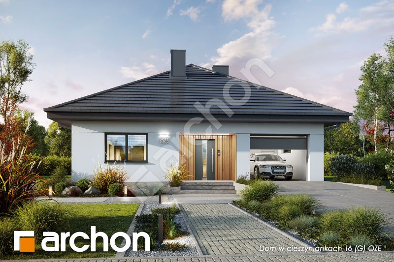 „Dom w cieszyniankach 16 (G) OZE” – mała parterówka z garażem i tarasowym podcieniem