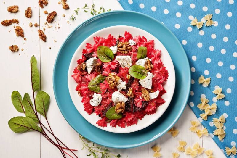 Do patelni z botwinką dodaj odcedzony, ugotowany makaron i oliwę. Wymieszaj wszystko z połamanym na kawałki kozim serem i posyp orzechami.