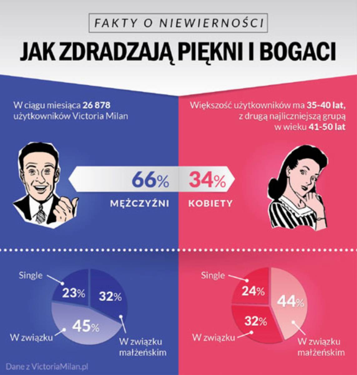 Jak zatem zdradzają mężczyźni? Czy stereotyp wykształconego biznesmena z Warszawy poszukującego pięknej blondynki o niezwykłych kształtach figury jest prawdziwy? Statystyki Victoria Milan są bezlitosne. Większość użytkowników portalu jest w wieku 30-35 (24,92%) 32,2% z nich jest zamężnych, 44,9% pozostaje w związkach, 22,9% to single. Podobnie jak w przypadku kobiet najwięcej mężczyzn pochodzi z Warszawy 16,36%, następnie z Krakowa 6,48%, Poznania 4,75%, Wrocławia 4,71% i Łodzi 3,63%. O swoim wykształceniu nie chciało mówić aż 43,39% użytkowników, 19,81% posiada wykształcenie wyższe, wykształcenie podstawowe (niepełne) zaledwie 1,71%.