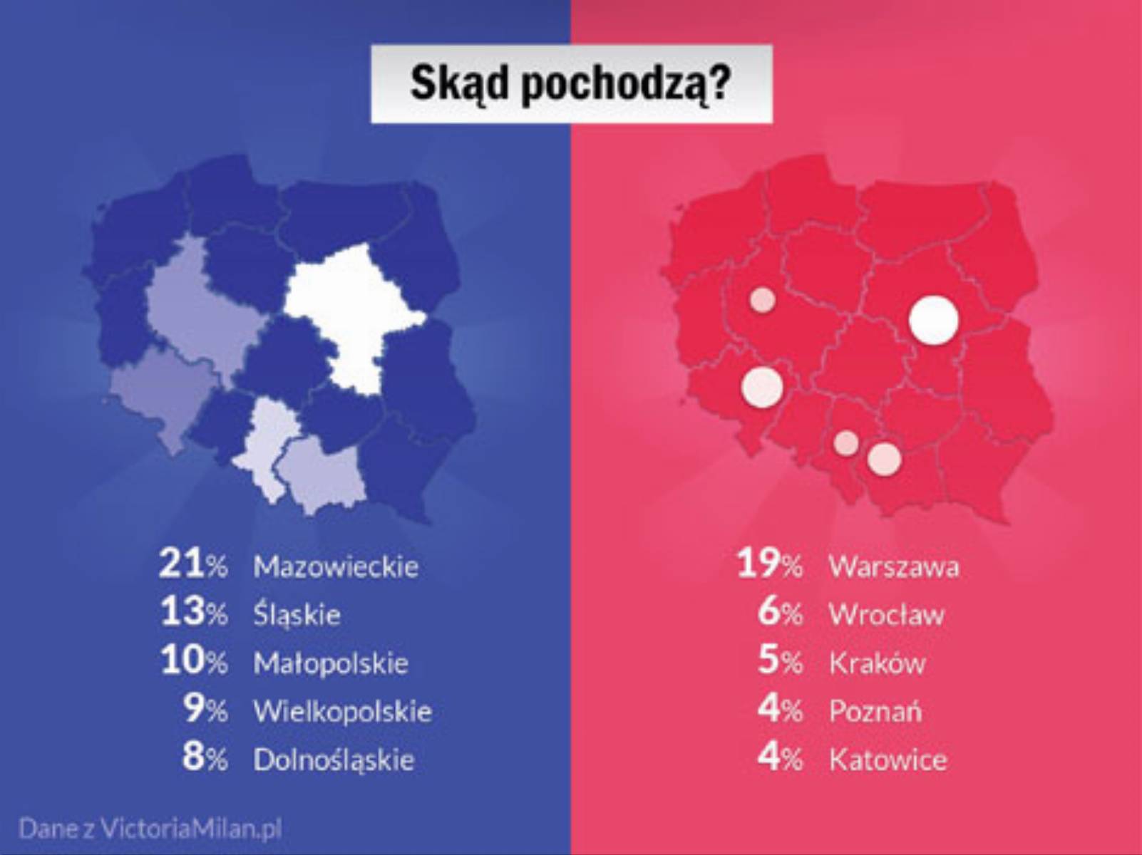 Oczywistym jest, że zdradzają najczęściej osoby z dużych miast, które dają anonimowość i poczucie komfortu. Skąd pochodzi najwięcej użytkowniczek portalu? Absolutnym liderem jest Warszawa 19,17%, następnie Wrocław 5,81%, Kraków 5,38%, Poznań 4,77% i Katowice 3,90%.