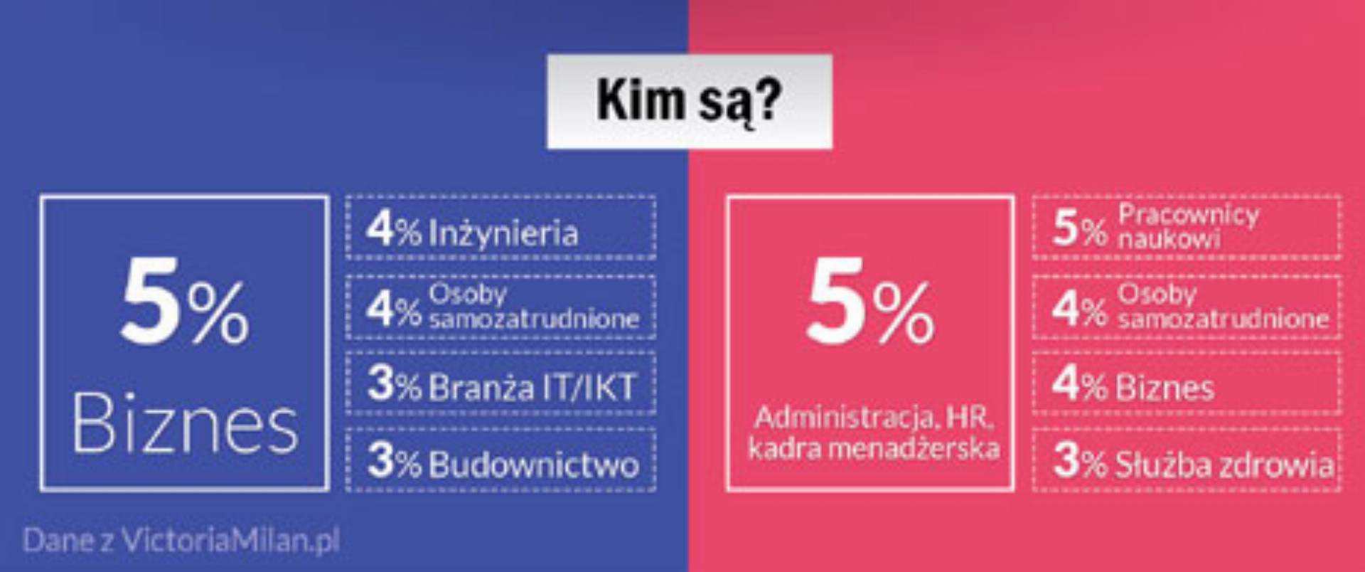 Jakie branże dominują wśród mężczyzn, którzy kochają zdradzać? Numer jeden, to biznesmeni 5,21%, kolejno inżynierowie 4,42%, właściciele przedsiębiorstw 4,09% pojawiają się również programiści (IT/ICT) 3,09% uważani dotychczas za nieśmiałych i zamkniętych w sobie – potwierdza się, że sieć po raz kolejny przełamuje bariery nieśmiałości i wstydu.