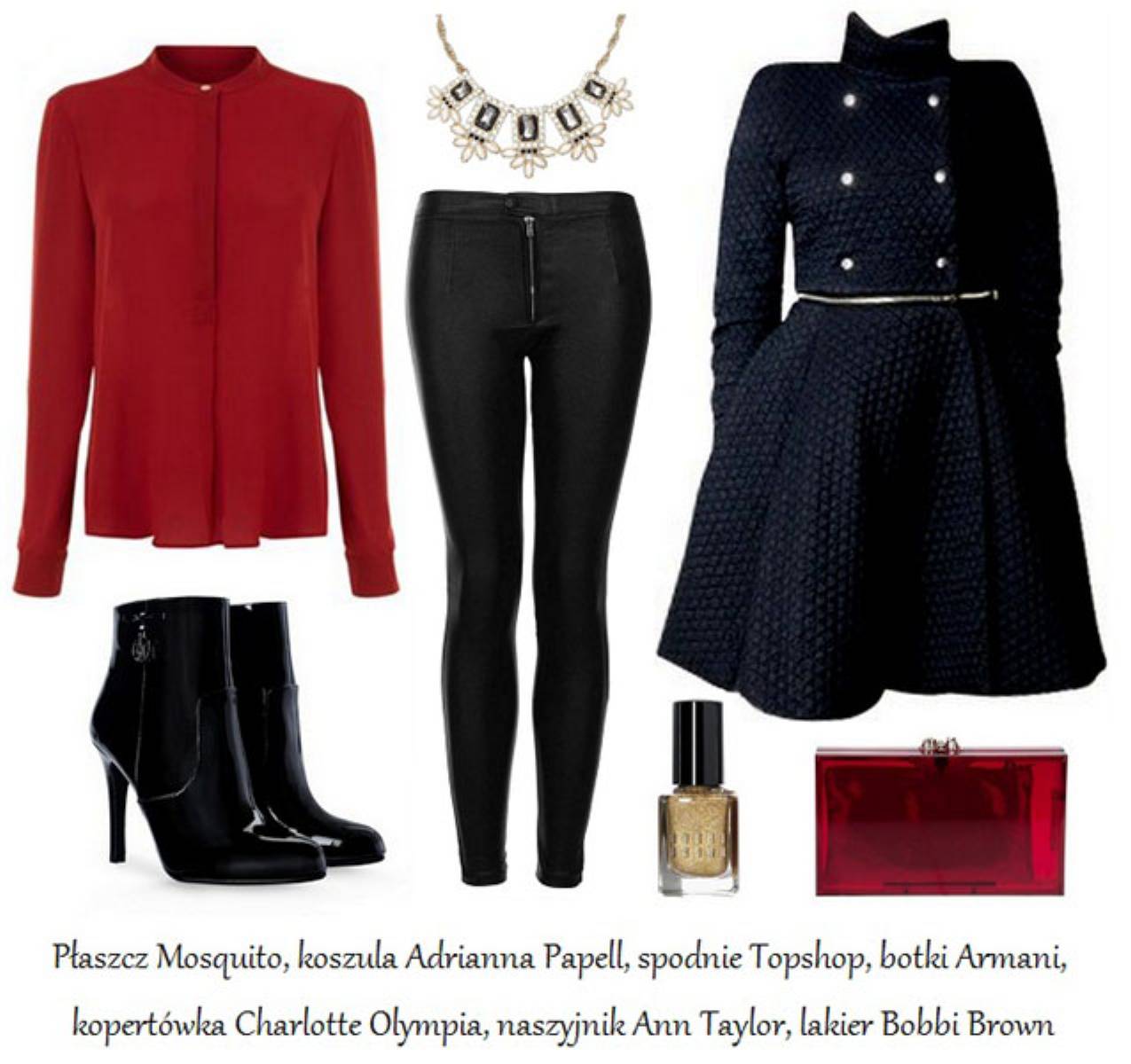 Czym byłyby Święta bez czerwieni? Skąpana w tym kolorze koszula stworzy zgrany duet ze skórzanymi spodniami. Elegancji dodadzą duży, ozdobny naszyjnik oraz lakierowane botki. Czerwona, przezroczysta kopertówka genialnie dopełni ten look, a ciepły, pikowany płaszcz z odpinanym dołem nie tylko doskonale ogrzeje w nawet największy mróz, ale też w razie konieczności posłuży za stylową marynarkę! Co Wy na to?