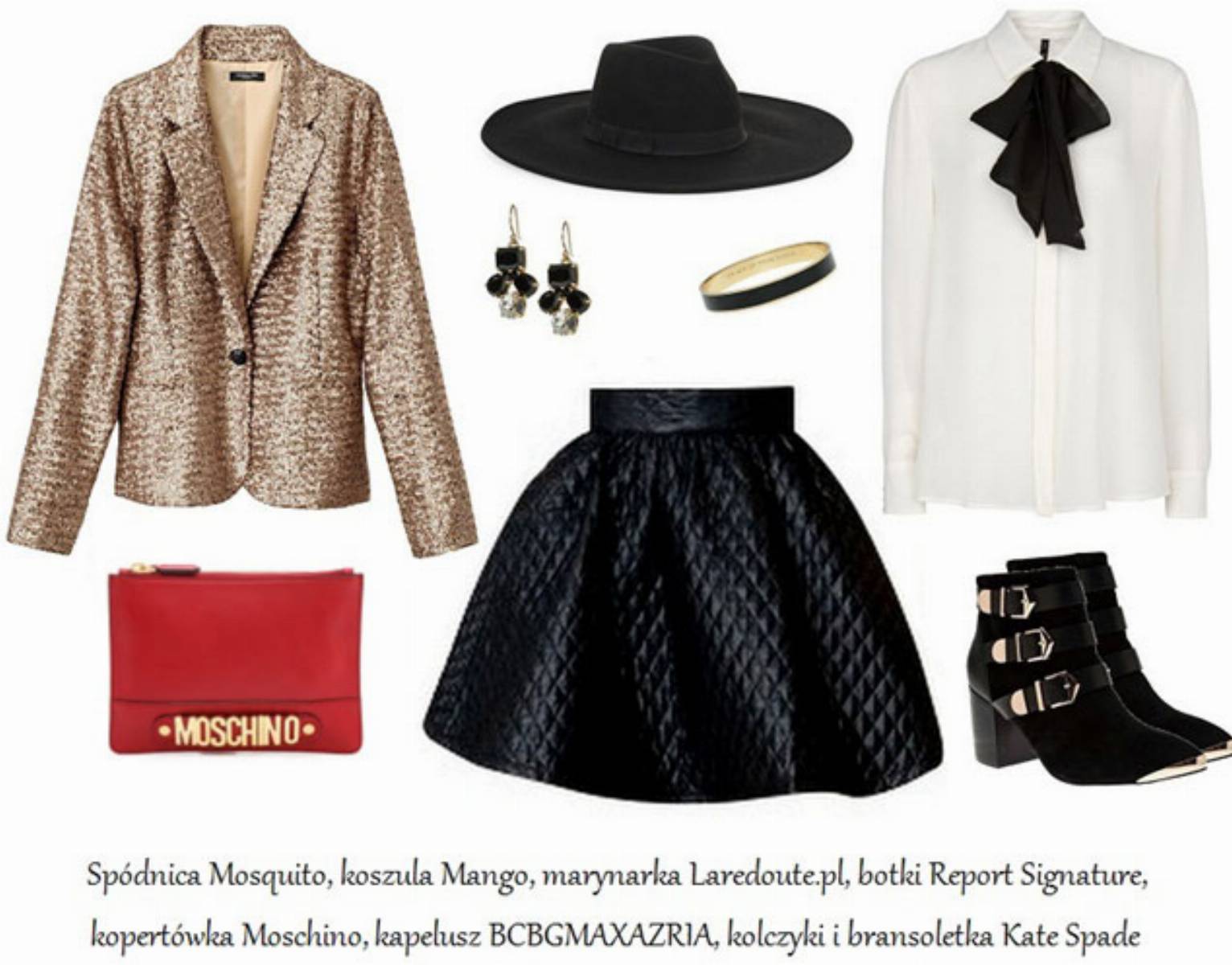 Rozkloszowana spódnica marki Mosquito podkreśli talię i będzie świetnie wyglądać w połączeniu z białą, gładką koszulą ozdobioną czarną kokardą. Złota, cekinowa marynarka doda blasku, botki ze złotymi klamrami oraz złotą aplikacją na nosku przykują uwagę, a kontrastująca z całym zestawem czerwona kopertówka pomieści wszystkie kobiece skarby. Ciekawym uzupełnieniem tej stylizacji będzie kapelusz z szerokim rondem. Oto modny i stylowy look w sam raz na świąteczną kolację!