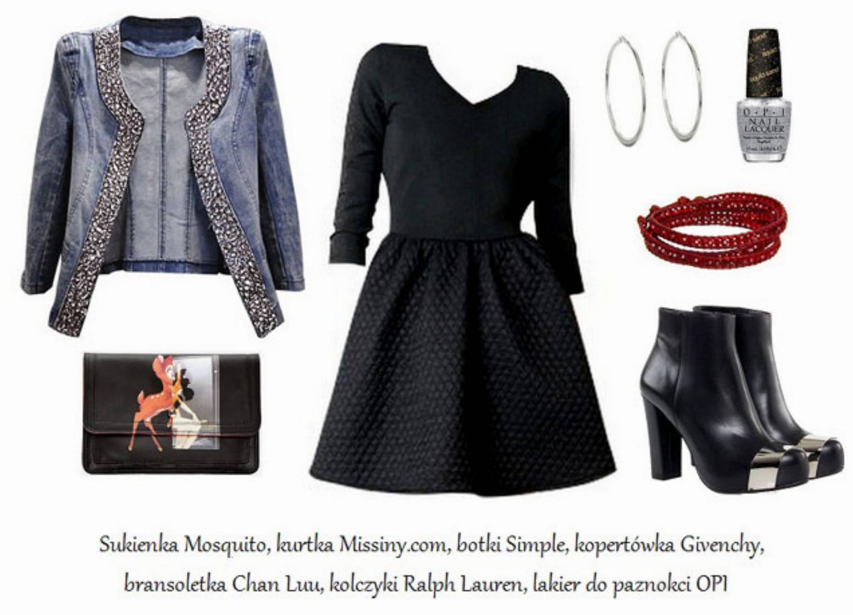 Tym razem zamiast złota stawiamy na srebro. Lekka, denimowa kurtka ozdobiona srebrnymi aplikacjami stworzy bardzo udany zestaw z czarną sukienką z gładką górą i pikowanym dołem. Skórzane botki na wysokim obcasie wydłużą nogę, a czerwona bransoletka oraz urocza kopertówka z jelonkiem Bambi nadadzą tej stylizacji ciekawego, niebanalnego charakteru.