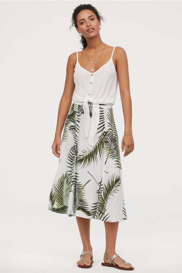 Długa luźna spódnica z nadrukiem w egzotyczne liście – H&M, 99,99 zł