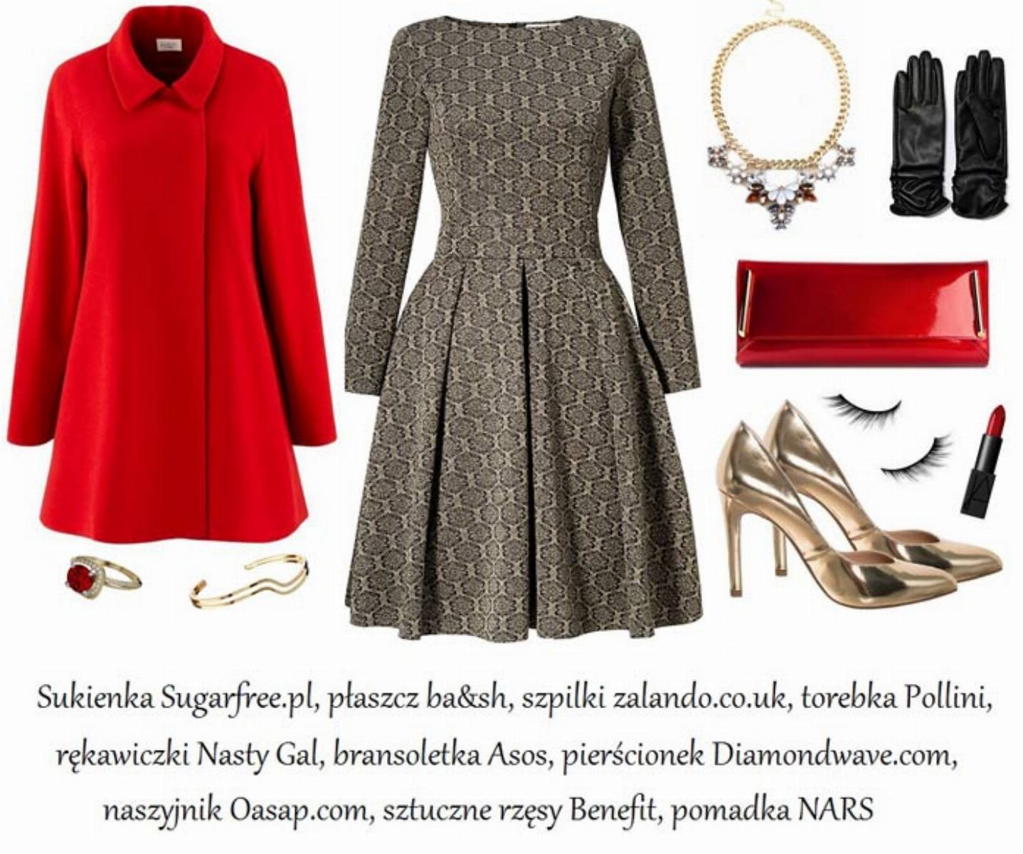 Złoto i świąteczna czerwień! Trudno oprzeć się temu duetowi. Właśnie dlatego tę złotą sukienkę o dziewczęcym kroju zestawiłyśmy z czerwonym płaszczem. Wszak Święta Bożego Narodzenia zbliżają się coraz większymi krokami. Warto więc zawczasu pomyśleć o odpowiedniej stylizacji. Ta przygotowana przez nas świetnie sprawdzi się nie tylko podczas Świąt, ale też różnych rodzinnych uroczystości czy podczas randki w eleganckiej restauracji. Jak Wam się podoba?