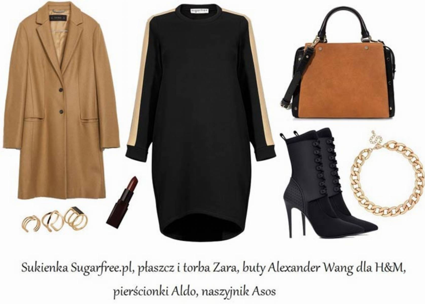 Kolejna nasza stylizacja to połączenie sportowego szyku z miejskim lookiem. Dresowa sukienka ze złotym lampasem będzie fenomenalnie wyglądać w duecie z botkami na wysokiej szpilce. Całość proponujemy utrzymać w czerni i brązach ze złotymi akcentami w postaci naszyjnika oraz zegarka. Bordowa szminka na ustach genialnie zwieńczy ten look. Ta propozycja sprawdzi się doskonale podczas wieczornych wypadów na miasto.