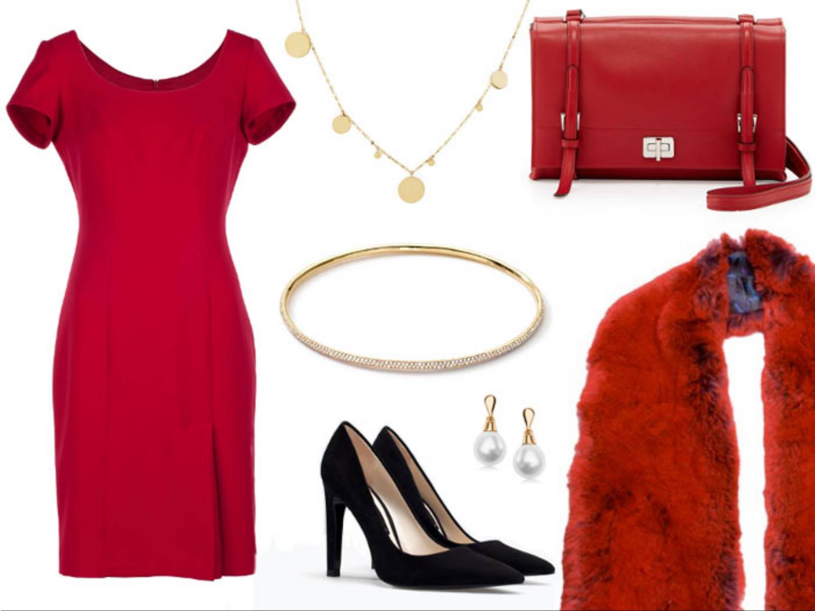 Do czerwonej sukienki z modną kontrafałdą na spódnicy warto dodać kontrastowe, czarne akcesoria, które przełamią monochromatyzm stylizacji. Subtelna złota biżuteria i kolczyki z perełkami sprawią, że stylizacja nabierze elegancji. Ciepły futrzany szal w kolorze wina jest nie tylko modnym, ale też praktycznym dodatkiem w zimny grudniowy wieczór.