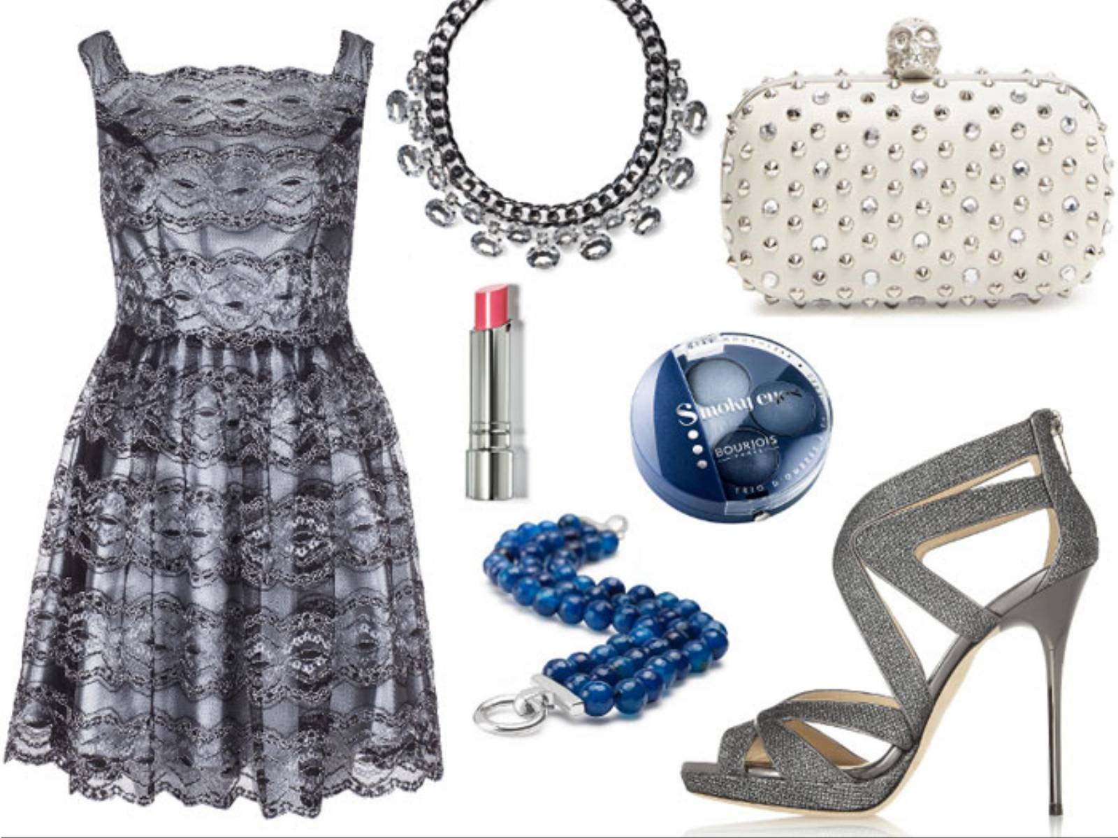 Koronki nadal rządzą na wybiegach i czerwonych dywanach, więc są naturalnym i eleganckim wyborem na Sylwestra. Do koronkowej sukienki ze srebrną podszewką i marszczoną spódnicą dobraliśmy wysadzane kryształkami sandałki oraz kopertówkę nabijaną ćwiekami i kryształkami. Bransoletka z niebieskimi agatami ożywi stylizację, a granatowosrebrny makijaż smoky eyes doda jej tajemniczości. Różowa szminka i manicure w kolorze fuksji świetnie ożywi chłodną srebrnoniebieską stylizację.