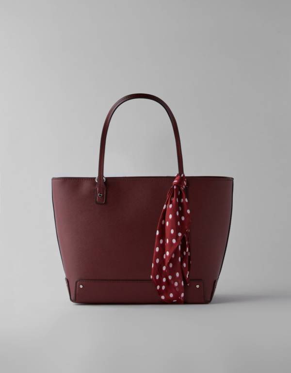 Bordowa torebka z efektem skóry saffiano i chustką w groszki – Bershka, 99,90 zł