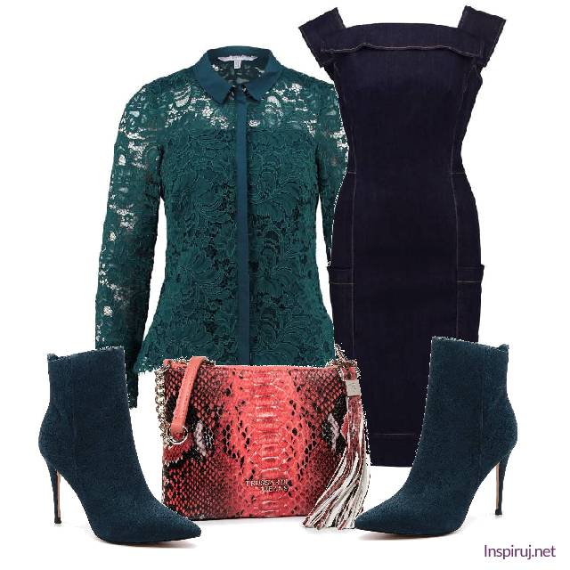 Druga wyróżniona stylizacja to nieco bardziej klasyczne i stonowane wykorzystanie sukienki z dekoltem karo. Granat został tu zestawiony z uspokajającą głębią zieleni. Koronkowa koszula z kołnierzykiem i botki na szpilce dodają powagi i elegancji. Szykowną całość przełamuje niezwykle oryginalna torebka w frędzlami i zwierzęcym wzorem. To stylizacja dla elegantki, która lubi kontrasty.