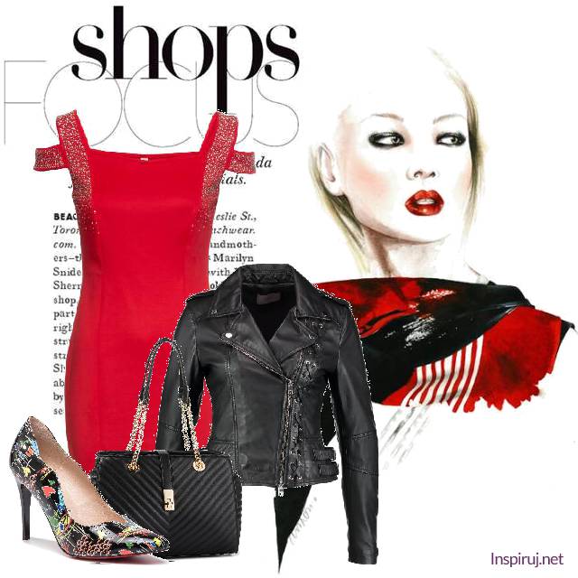 Pierwsza stylizacja opiera się na mocnych zestawieniach. Czerwona sukienka z drobnymi, migocącymi aplikacjami przy dekolcie będzie kusiła i wabiła. To kreacja idealna dla kobiety wamp, która nie boi się podkreślać swoje walory. Do tego uniwersalna i zawsze modna ramoneska dodaje całości rockowego pazura. Zestaw imprezowej dziewczyny nie może się obyć bez torebki, do której można wrzucić czerwonką szminkę i maskarę (by w każdej chwili poprawiać wieczorowy makijaż), a także szałowych i oryginalnych szpilek, które dodają całemu wyglądowi ekstrawagancji.
