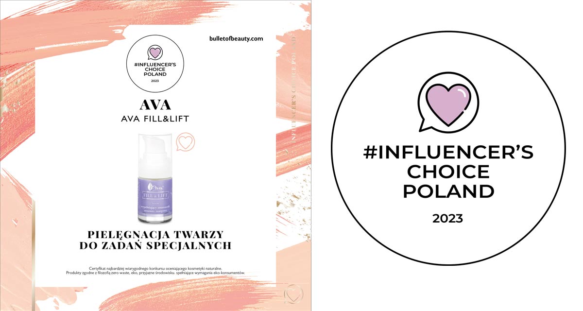 Kolejna nagroda dla linii FILL&LIFT od Laboratorium Kosmetycznego AVA. Po otrzymaniu nagrody w plebiscycie Doskonałość Roku 2023 organizowanym miesięcznik „Twój STYL”, ta sama seria została doceniona w konkursie Influencer’s Choice 2023. Jest to konkurs oceniający kosmetyki i produkty naturalne.