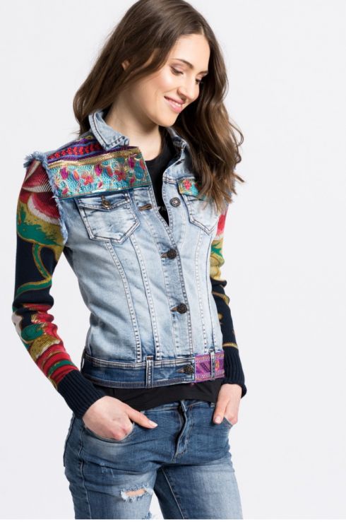 Dżinsowa kurtka-kamizelka z kwiatami i kolorowym szlaczkiem – Desigual, 519,90 zł