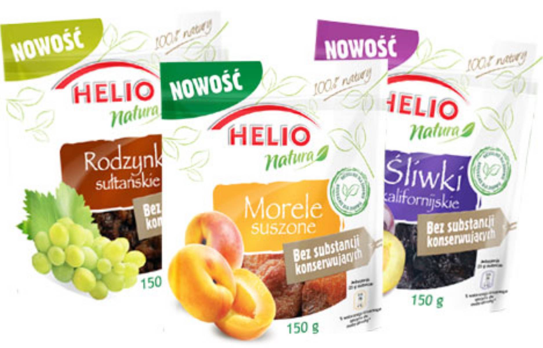 Marka HELIO, wiodący producent bakalii, w tym owoców suszonych wprowadza na rynek nową linię produktów „HELIO Natura”. Nowa seria bakalii powstała w odpowiedzi na zapotrzebowanie konsumentów na naturalną, mało przetworzoną żywność, która nie zawiera konserwantów. HELIO Natura odpowiada również na potrzeby osób pragnących zminimalizować ryzyko zapadnięcia na choroby cywilizacyjne. Linię otwierają śliwki kalifornijskie, morele suszone oraz rodzynki sułtańskie – wszystkie produkty są dostępne w opakowaniach o gramaturze 150 gram.