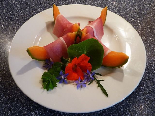 Sałatę, melona oraz zioła płuczemy pod bieżącą wodą, oddzielamy liście. Melona kroimy w małe półksiężyce, a następnie otulamy zawijając w plastry szynki dojrzewającej. Przekrojoną po długości bagietę wyściełamy sałatą, a następnie przygotowanymi melonem z szynką. Całość dekorujemy listkami ziół. Gotowe. Smacznego!