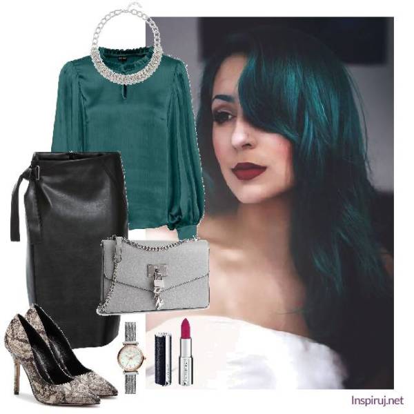 Druga stylizacja to bardzo elegancka odsłona grubego łańcucha. W tym przypadku jego rolę pełni srebrny naszyjnik od Bonprix, który dobrze współgra z torebką – również wyposażoną w łańcuszek. Elementy te ładnie wykańczają zestaw z efektowną bluzką o morskim odcieniu i kopertową spódnicą ze sztucznej skóry. Pozostałe dodatki – jak wężowe szpilki, zegarek na srebrnej bransoletce czy ożywiająca wszystko pomadka, doskonale wpisują się w „służbowy” styl całego stroju i akcentują jego elegancję.