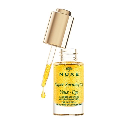 Koncentrat NUXE Super Serum Eye przeciwdziała starzeniu się skóry wokół oczu. Jego konsystencja jest lekka i wchłania się w skórę nie pozostawiając tłustego wykończenia. Działanie kosmetyku skupia się na rozjaśnieniu i odświeżeniu spojrzenia, nadając mu wygląd o 10 lat młodszy. Kosmetyk zawiera starannie wyselekcjonowane składniki, naturalnego pochodzenia, które wnikają w głąb skóry, skutecznie działając w jej głębokich warstwach. Zawarty w nim niacynamid, który mimo swojego łagodnego działania, odpowiedniego dla wrażliwej skóry, ma silne działanie antyoksydacyjne, pomaga niwelować procesy starzenia i redukuje widoczność przebarwień. Kofeina roślinna posiada zdolność do stymulacji krążenia oraz sprawia, że skóra jest lepiej dotleniona, jej koloryt staje się wyrównany, a cienie pod oczami znikają. Biomimetyczny peptyd to kolejny składnik, który zapobiega glikacji kolagenu (która wpływa na zwiększenie ilości wolnych rodników), dzięki czemu skóra dłużej zachowuje jędrność.
