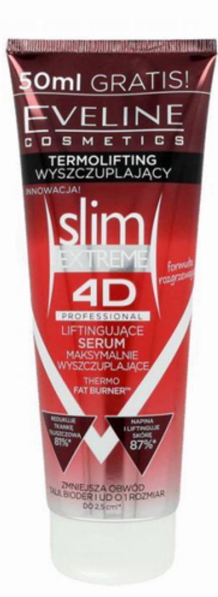 Inspirowane termoliftingiem serum SLIM EXTREME 4D, zapewnia efekt przyjemnego miejscowego rozgrzania, który w połączeniu z właściwościami zaawansowanych składników aktywnych naśladuje mechanizm działania fal radiowych na komórki tłuszczu. Przyspiesza ich spalanie, intensywnie napina i liftinguje, zmniejszając obwód talii, bioder i ud o 1 rozmiar. Jest idealnym uzupełnieniem diety i ćwiczeń w wyszczuplaniu i modelowaniu doskonałej sylwetki.
