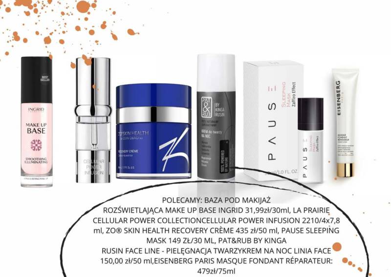 POLECAMY: BAZA POD MAKIJAŻ ROZŚWIETLAJĄCA MAKE UP BASE INGRID 31,99zł/30ml, LA PRAIRIE CELLULAR POWER COLLECTIONCELLULAR POWER INFUSION 2210/4 x 7,8 ml, ZO® SKIN HEALTH RECOVERY CRÈME 435 zł/50 ml, PAUSE SLEEPING MASK 149 ZŁ/30 ML, PAT&RUB BY KINGA RUSIN FACE LINE – PIELĘGNACJA TWARZYKREM NA NOC LINIA FACE 150,00 zł/50 ml/ EISENBERG PARIS MASQUE FONDANT RÉPARATEUR: 479 zł/75 ml