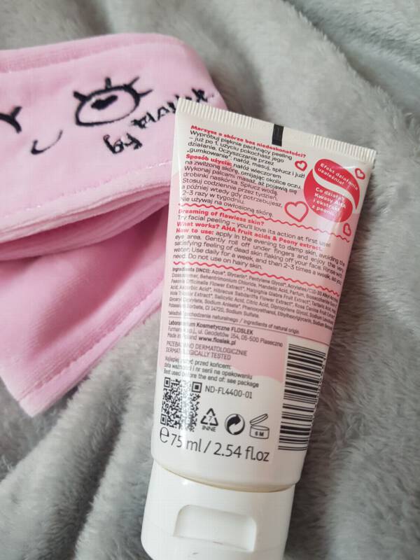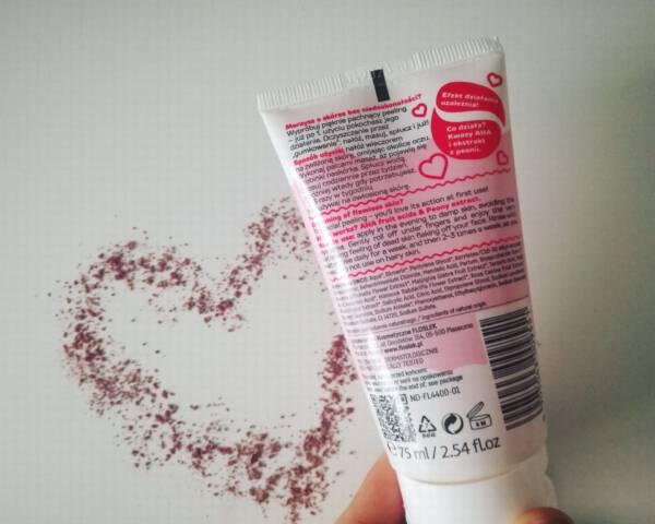 Peeling zamknięty został w tubce opatrzonej wesołą różową grafiką, bez problemu można zaaplikować z niego właściwą ilość produktu, dzięki czemu będziemy mogli używać go przez dłuższy czas. Opakowanie zawiera 75 ml produktu i nawet przy częstym stosowaniu będzie to bardzo wydajny kosmetyk. Z tyłu opakowania znajdują się wszelkie niezbędne informacje na temat samego produktu. W składzie peelingu znajdują się kwasy AHA, kwas migdałowy oraz ekstrakt z peonii.