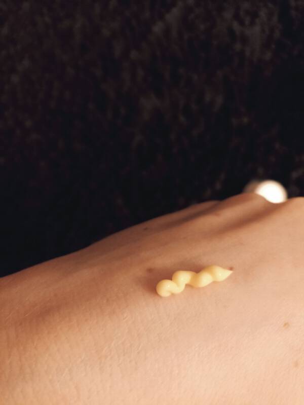 Konsystencja produktu jest nieco bardziej zwarta niż wszelkich typowych kremów do twarzy, co dla mnie jest dużym plusem. Nie muszę się męczyć żeby dobrać odpowiednią ilość produktu do swoich potrzeb. Krem ma delikatny, jasnożółty/beżowy kolorek. Po rozsmarowaniu na twarzy nie pozostawia tłustego filmu, ale jednocześnie odczuwa się że „coś” na tej buzi jest. Dość szybko się wchłania. Nie potrzeba go dużo żeby pokryć dokładnie całą twarz